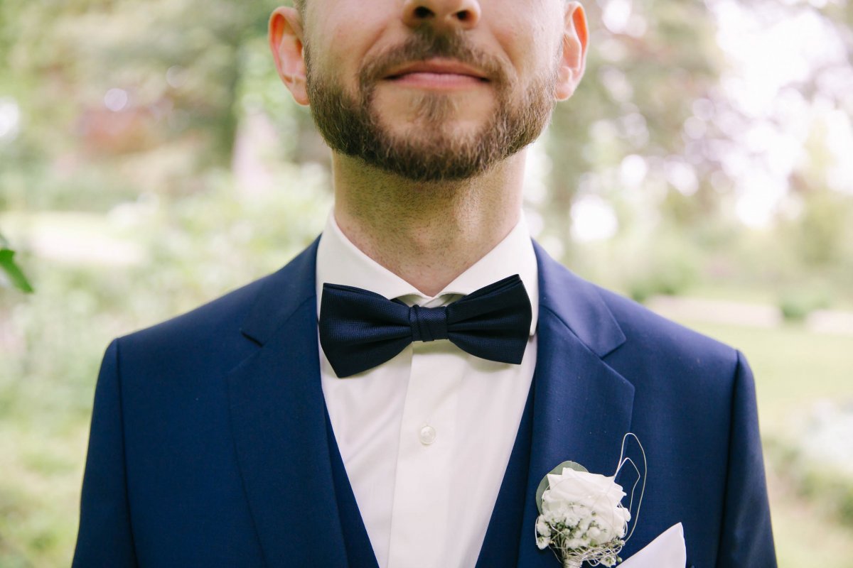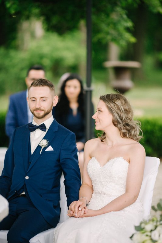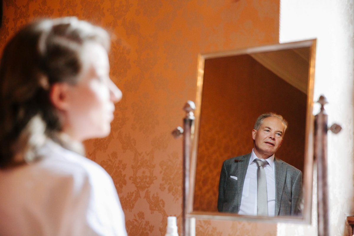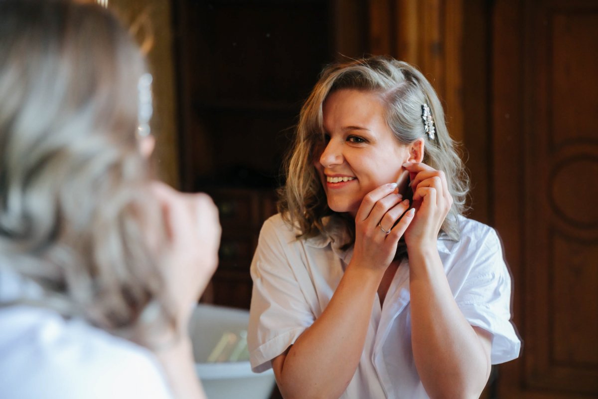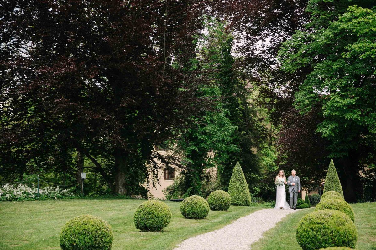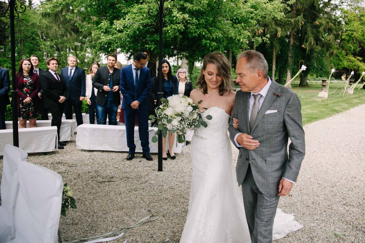 Der letzte Schliff und der letzte Blick aus dem Fenster zu Gästen, die sich schon tummeln. Dann ist es mit dem Papa zur Trauung im Garten des Schlosses gegangen.