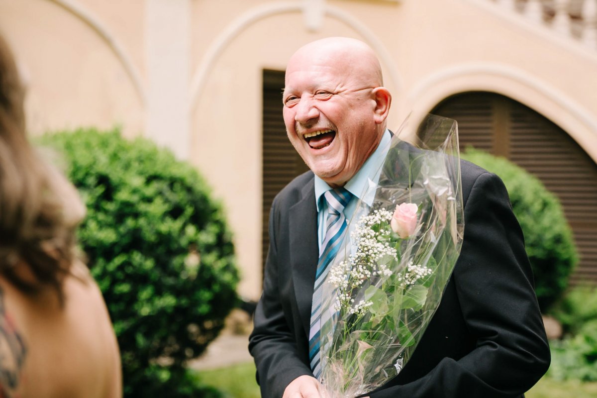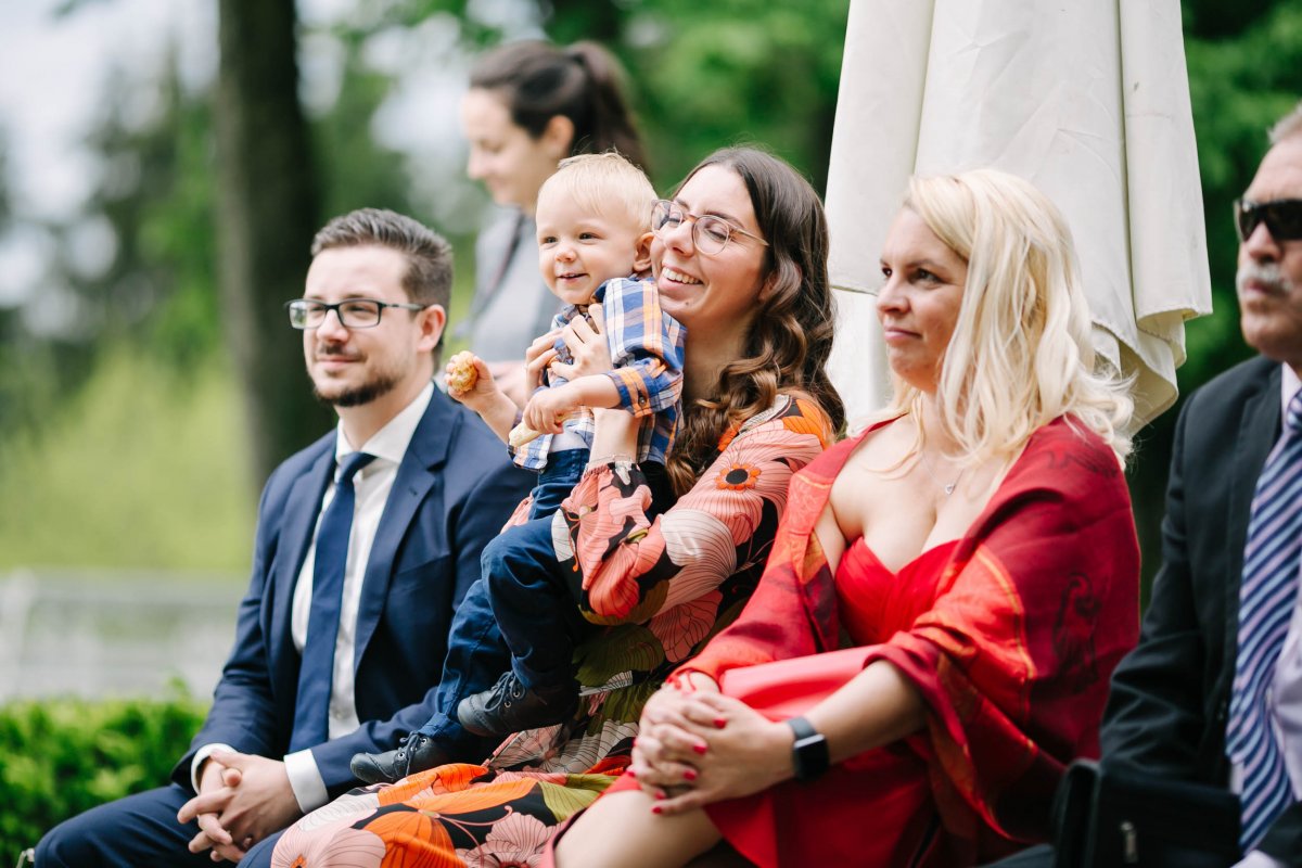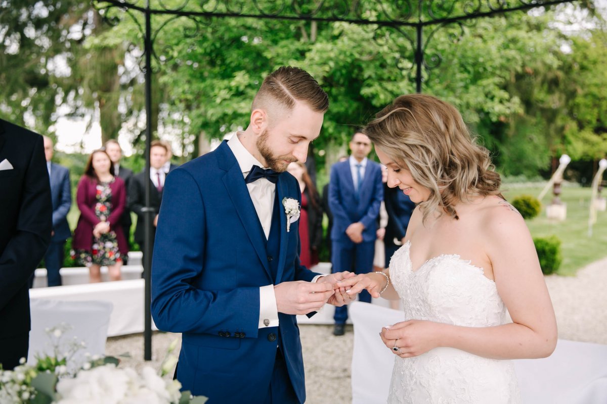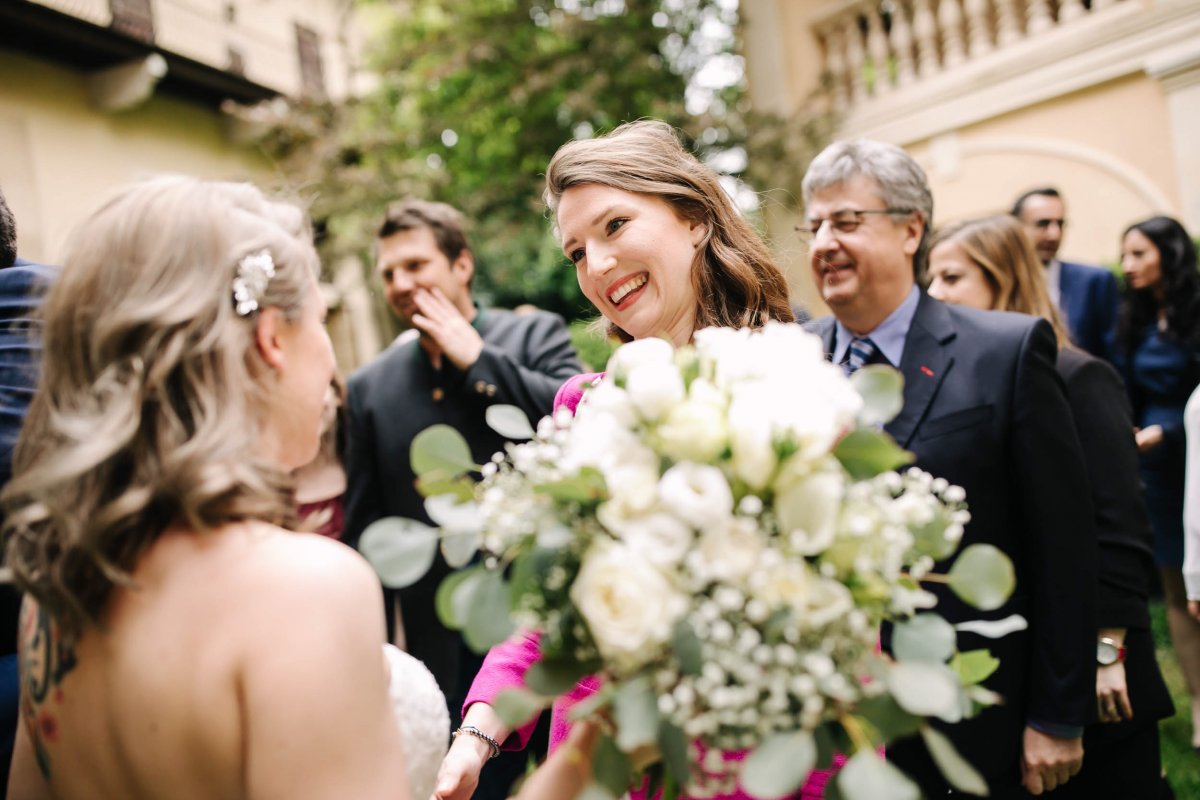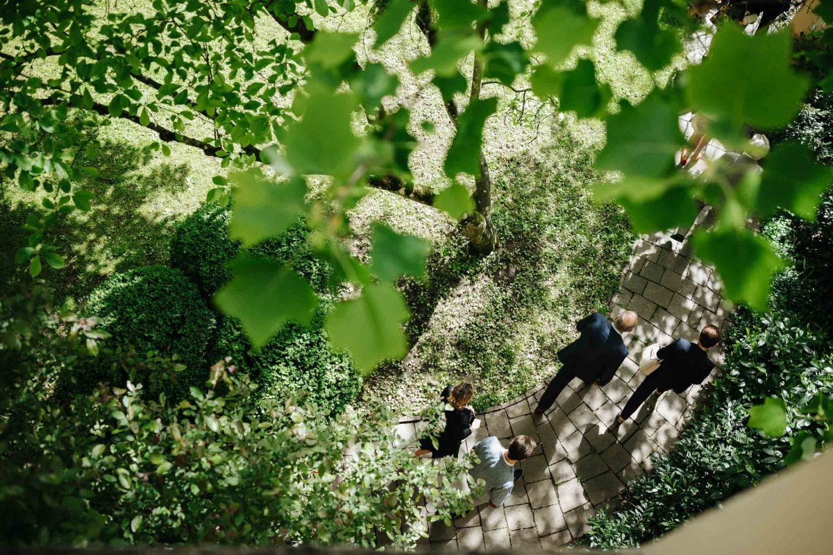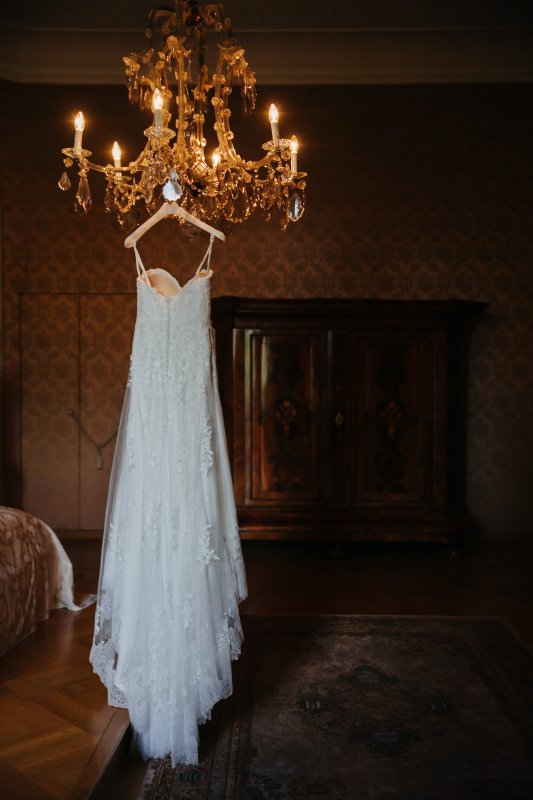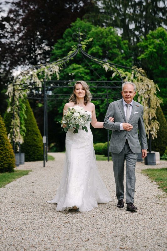 Der letzte Schliff und der letzte Blick aus dem Fenster zu Gästen, die sich schon tummeln. Dann ist es mit dem Papa zur Trauung im Garten des Schlosses gegangen.