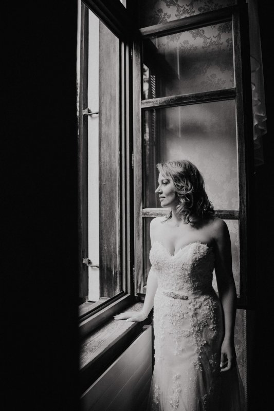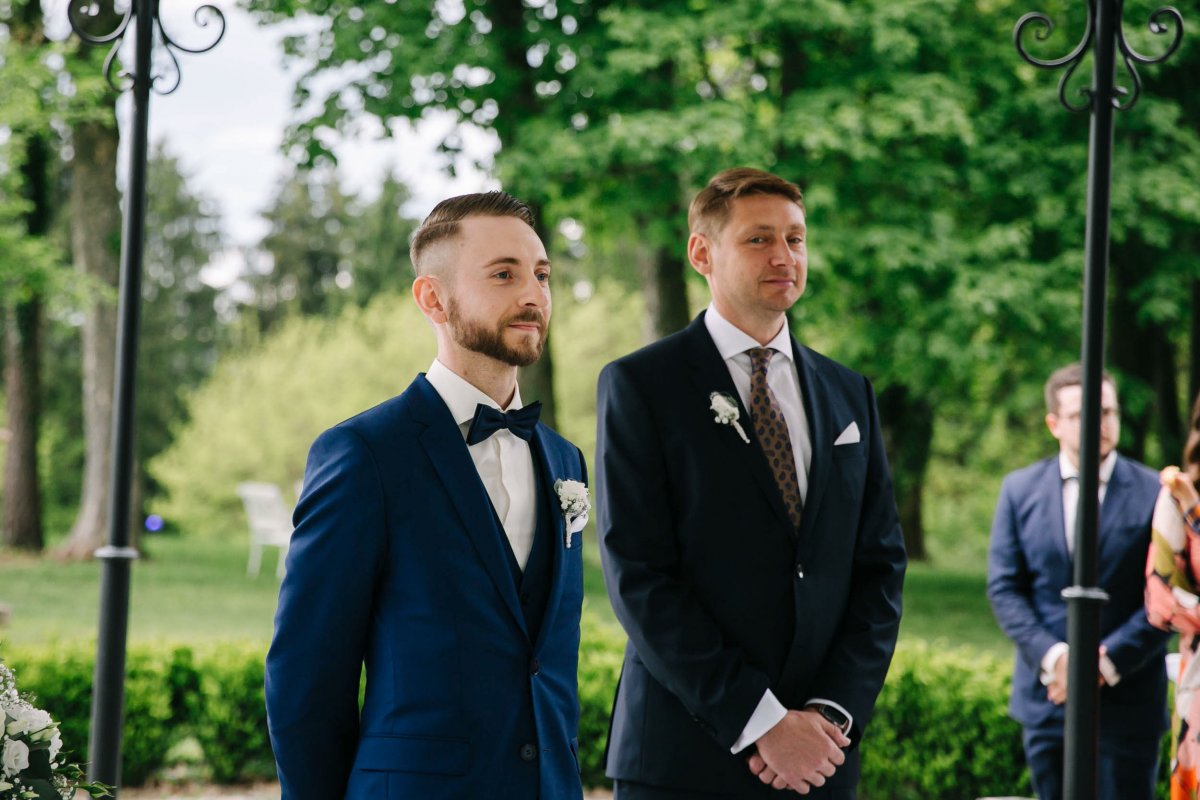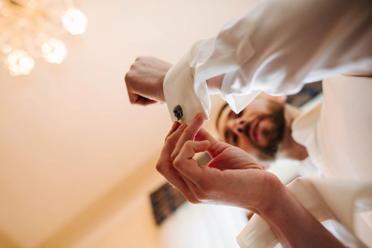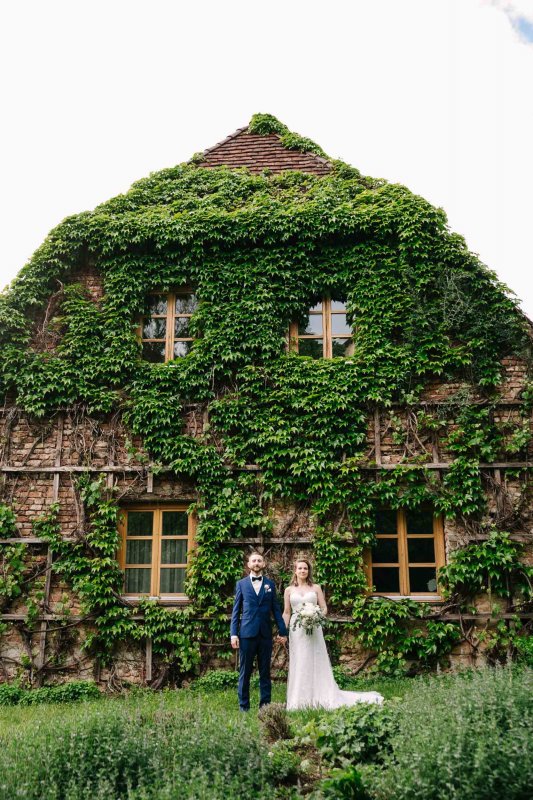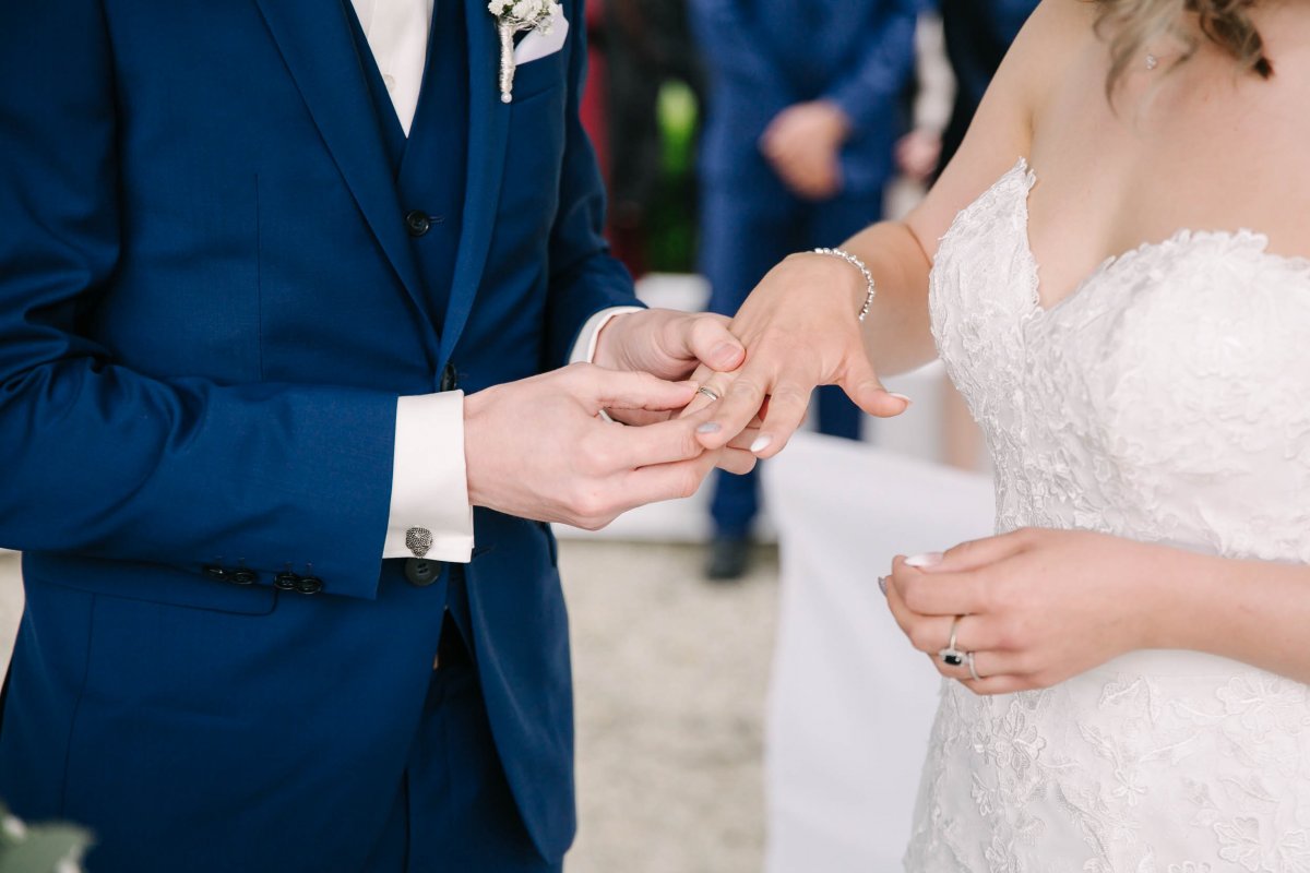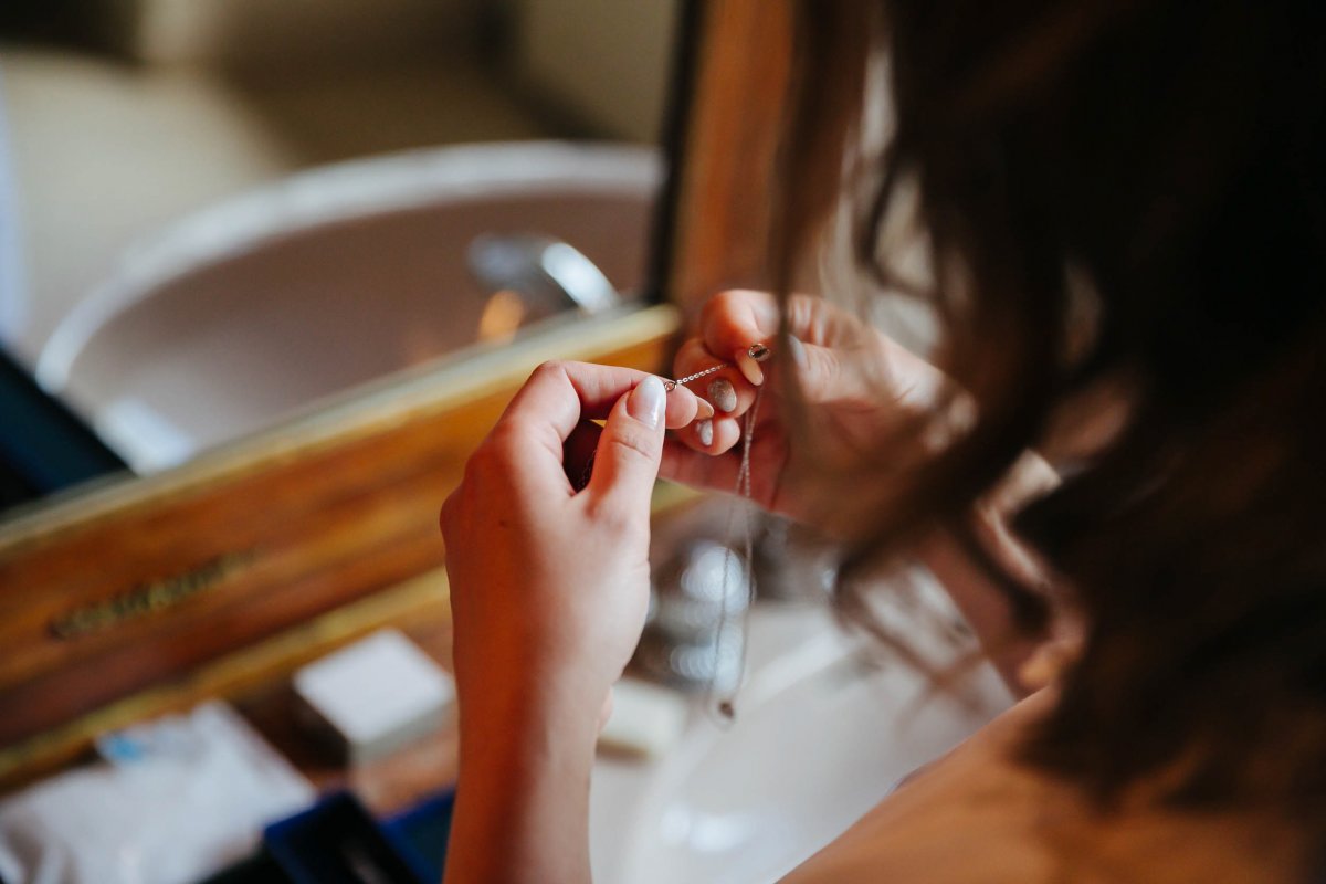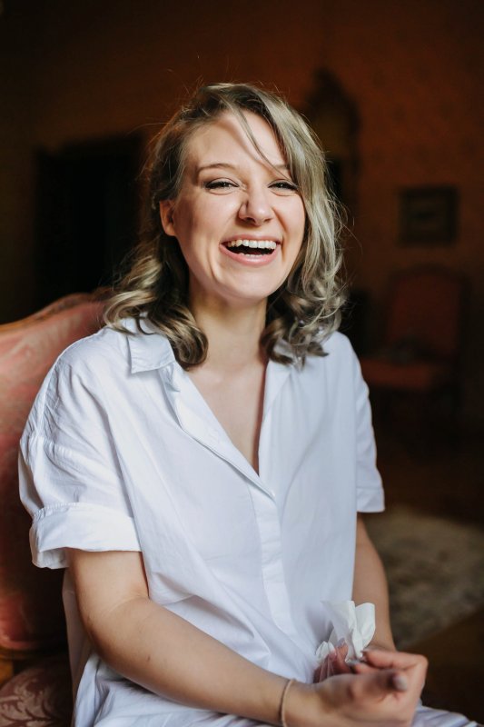 Der letzte Schliff und der letzte Blick aus dem Fenster zu Gästen, die sich schon tummeln. Dann ist es mit dem Papa zur Trauung im Garten des Schlosses gegangen.