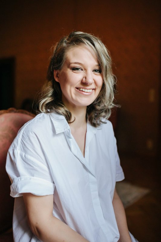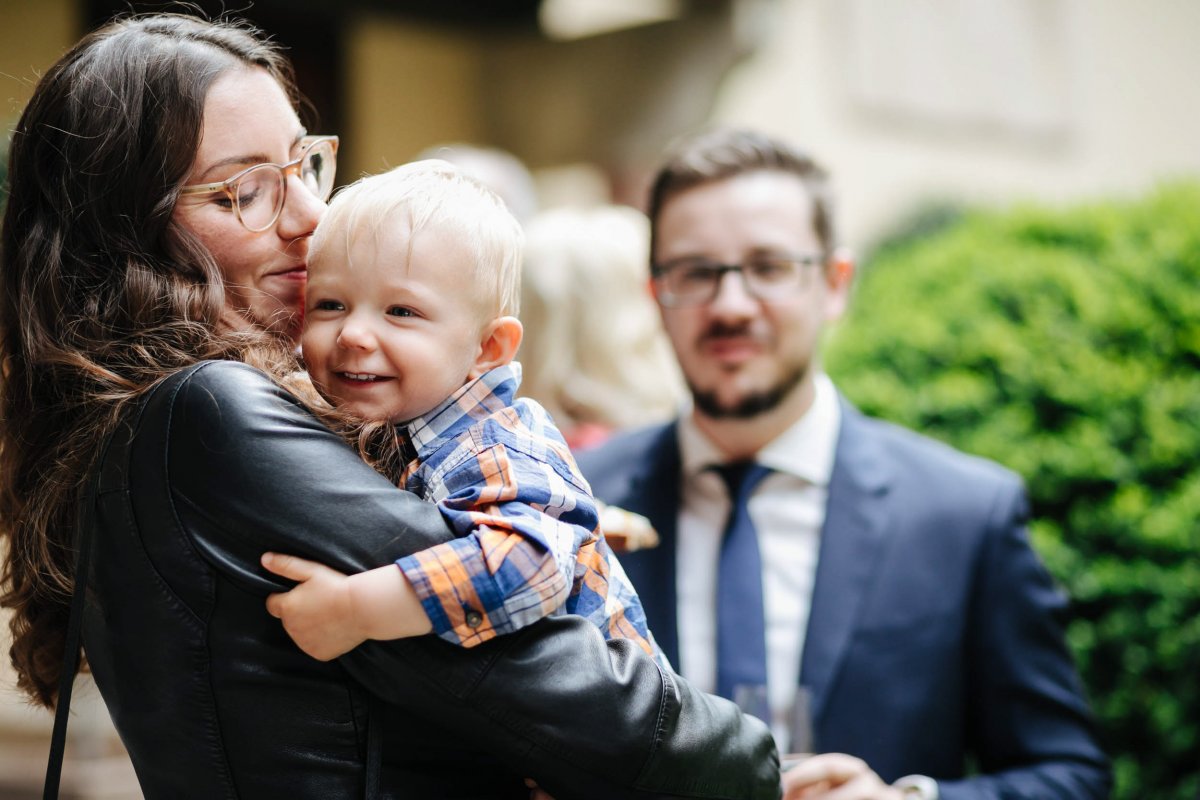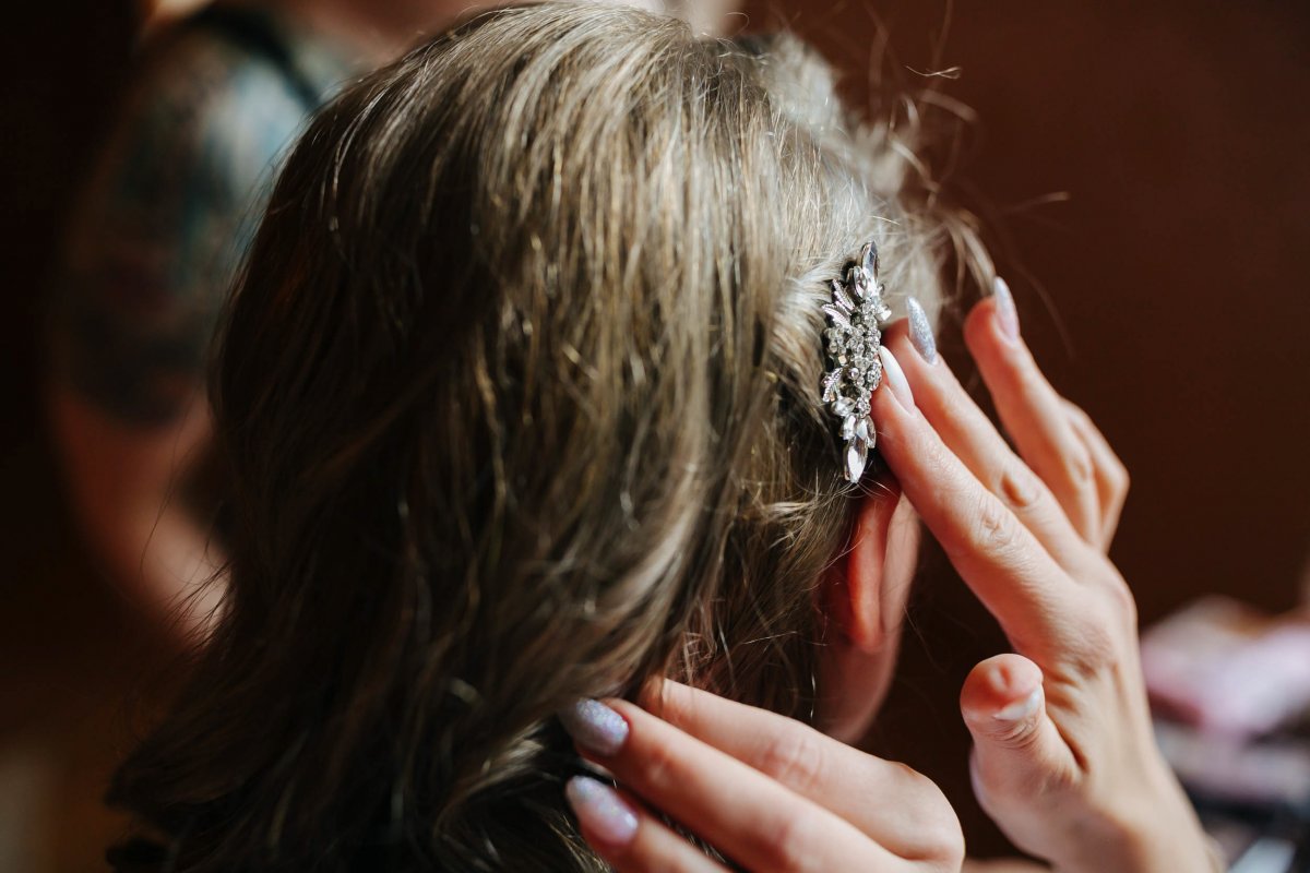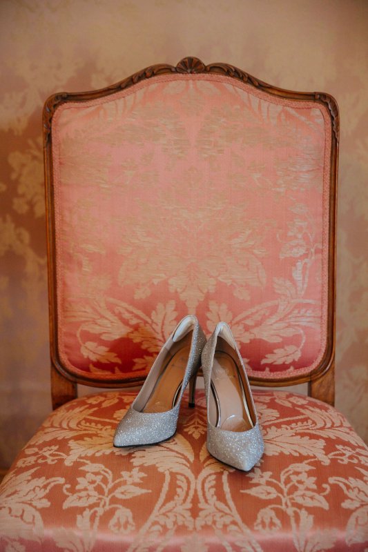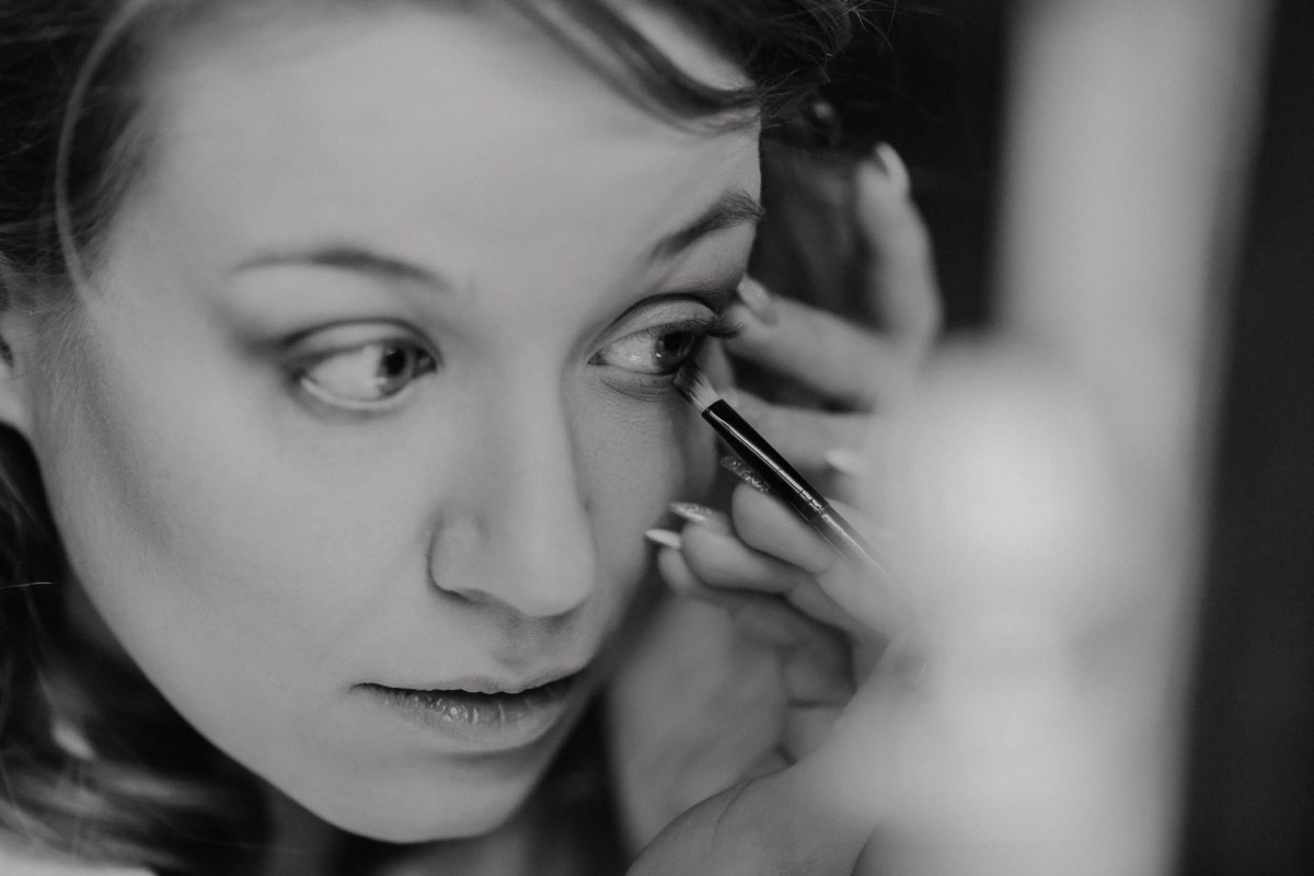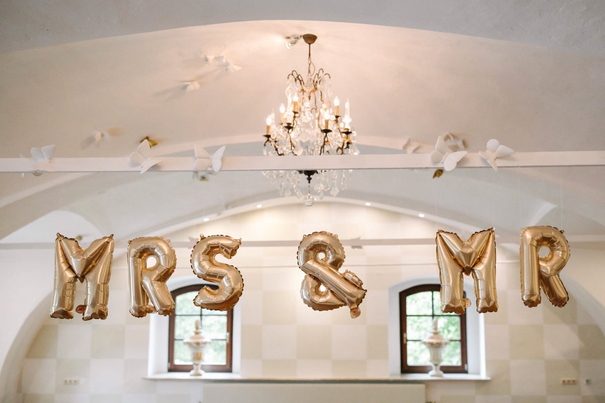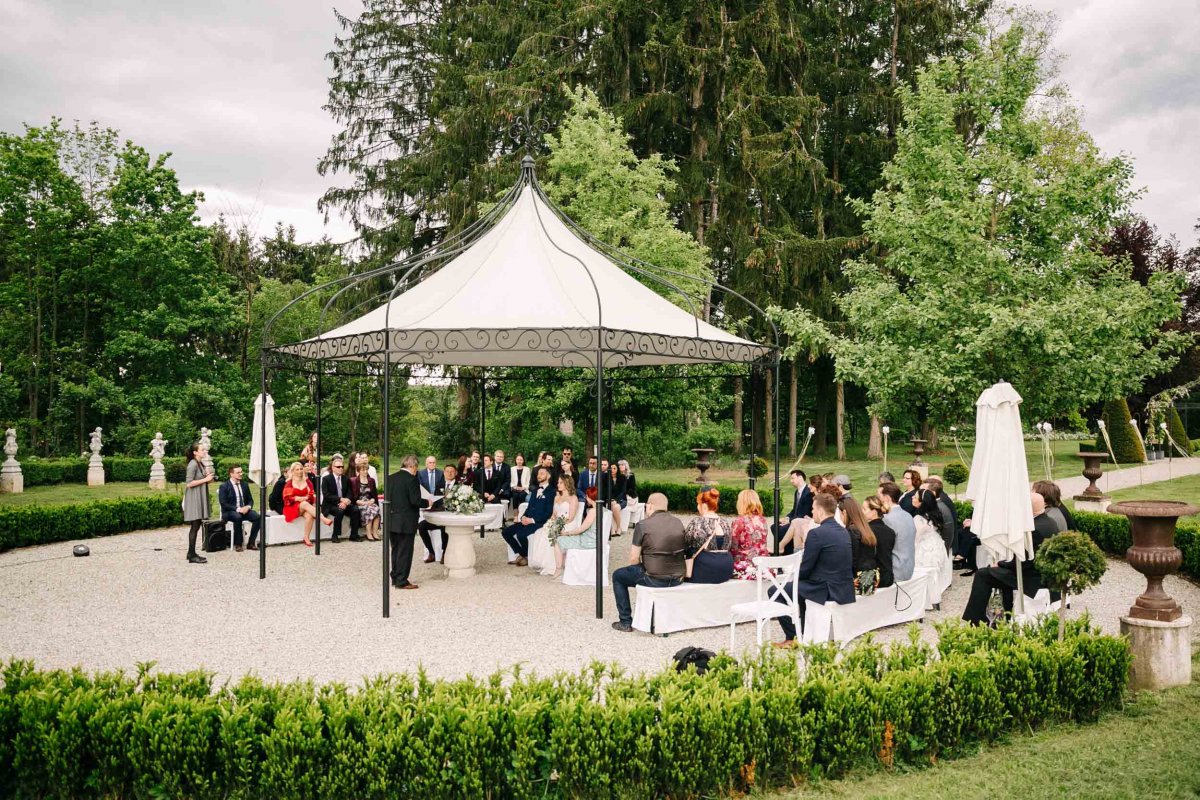 Der letzte Schliff und der letzte Blick aus dem Fenster zu Gästen, die sich schon tummeln. Dann ist es mit dem Papa zur Trauung im Garten des Schlosses gegangen.